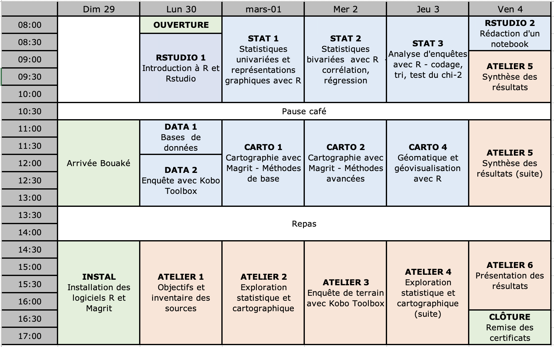 - 29 Juin : Les participants seront accueillis le dimanche 29 matin sur le lieu de formation. L’après-midi sera consacré à l’installation des bases de données et logiciels sur les ordinateurs personnels.